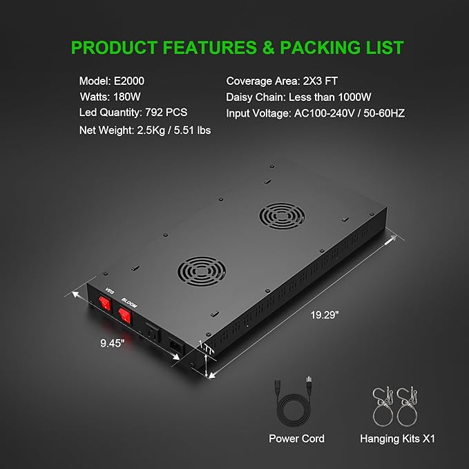 - 【High Yield & Low Power Consumption】Our led grow lights feature 792 high-quality LED beads, boasting an impressive energy efficiency of 2.7 μmol/J. The light's above is made of acrylic glass, which enhances light penetration and overall efficiency. Compared to traditional HPS lights, you can save up to 60% on electricity bills, as our E2000 LED grow light is equivalent to a powerful 720W HPS light while consuming only 180W!