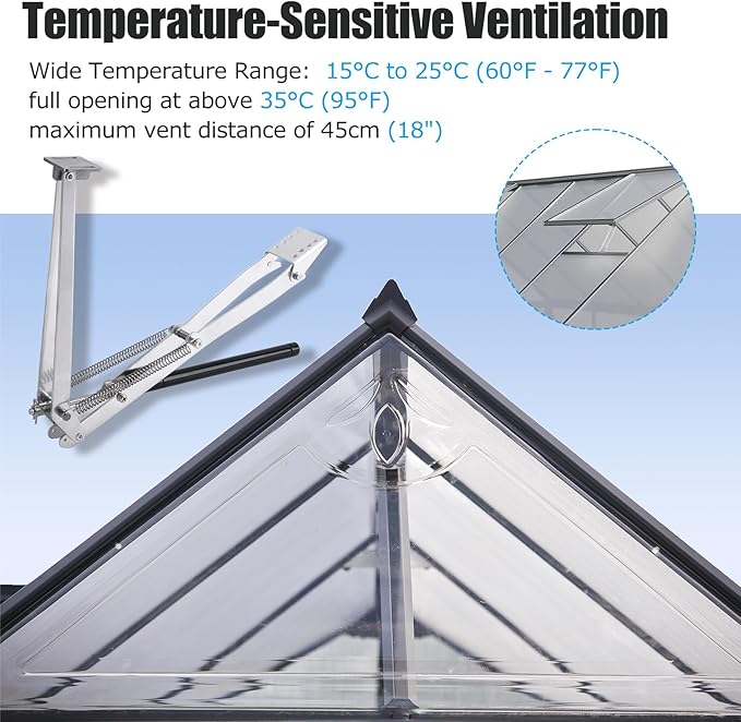 - Easy Installation and Compatibility : Installing the auto vent opener is quick and straightforward with the provided clamps and screws. Greenhouse window opener fits most greenhouse windows and seamlessly integrates with roof vents for houses, making it a versatile choice for different setups