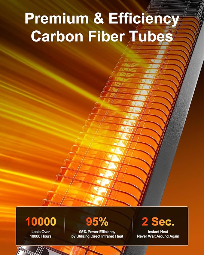 - š„Instant Heating & Energy Saving: This space heater is both an indoor and outdoor heater, adopted advanced carbon fiber heating wire and aluminum mirror. When you turn it on within 3 seconds, the infrared heater instantly warms up and transfers the heat directly to the body, having high accuracy of heating, with an energy efficiency ratio of up to 95%. You can feel comfortably warm instantly, no need to wait in the cold for a long time.