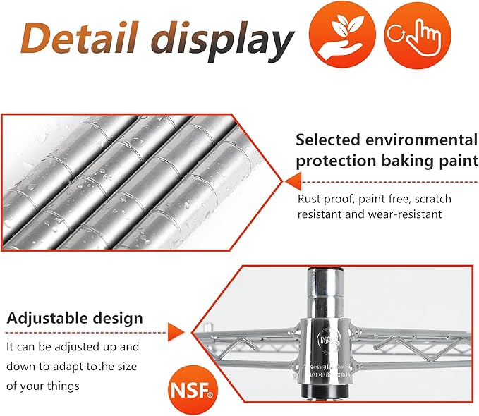 - CUSTOMIZABLE HEIGHT OPTIONS: Adjustable wire shelving design lets you tailor spacing between two racks for closet storage, garage shelving, or kitchen organization. Perfect for varying item sizes.