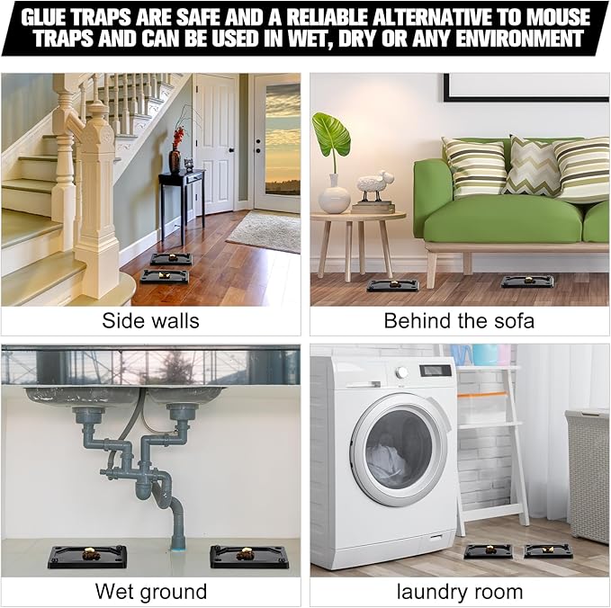 - Easy to Use: our mouse and snake glue traps can be placed in places where mice, snakes, rodents or insects are often infested, with the glue surface facing up, and 3 or 4 traps can be placed in a cage, or the mouse trap; Put some food in the middle to attract insects or rodents, such as bread crumbs, cheese, ham, candy, fruit, ice cream, to increase the probability of gluing rats