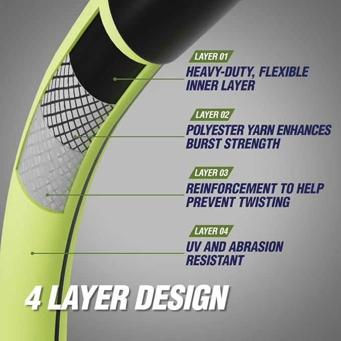 - HEAVY DUTY 4 LAYER DESIGN: ultra strong, heavy duty hose to tackle any outdoor job; abrasion and crush resistant for maximum durability; UV and rust resistant with high quality anodized aluminum couplings for use in all weather