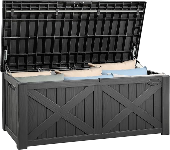 - LARGE STORAGE SPACE- 120-gallon capacity results in a roomy storage solution for your garden tools, pool supplies, sporting equipment, etc., on patio, deck, or porch; Featuring 661lbs. weight capacity, this waterproof outdoor storage box can double as an extra table or patio bench to accommodate two peoples