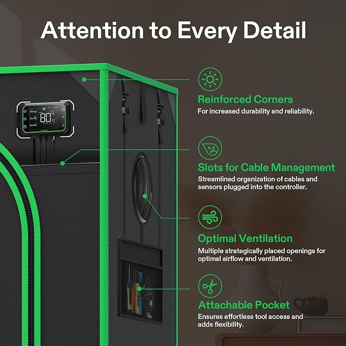 - Upgraded Lightproof Fabric: Durable 2000D Oxford canvas lined with plant-friendly PE and 100%-reflective Mylar; The three-layer thick fabric ensures zero light leaks, boosting the output efficiency of your setup; Zipper section is designed with black inner lining for enhanced light prevention