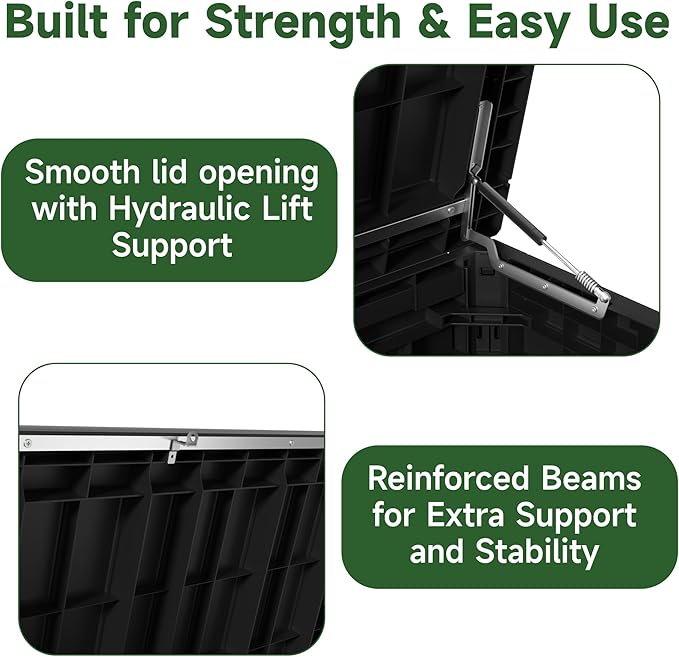 - ENHANCED SAFETY FEATURES - The EasyUp storage box features a hydraulic rod that allows for smooth lid opening and closing, reducing the risk of accidental pinching. The built-in locking mechanism adds an extra layer of security, making it ideal for safeguarding outdoor valuables.