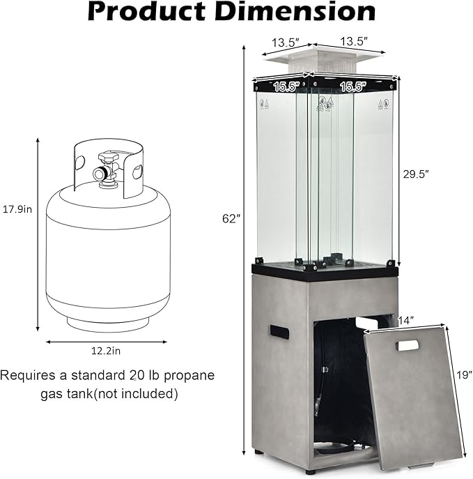 - Ignite with Confidence - Stay Safe: Seamlessly attach our patio heater to a 20 lbs propane gas cylinder (not included) and experience quick, easy ignition. Embrace the comfort of simple starting by pressing and turning the gas control knob, while a 15-second hold of the ignition button sets the magic in motion. The flame-out protection stands as your sentinel, promptly halting the gas flow for an extra layer of safety.