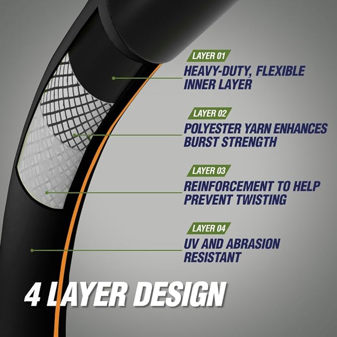 - HEAVY DUTY 4 LAYER DESIGN: ultra strong, heavy duty hose to tackle any outdoor job; abrasion and crush resistant for maximum durability; UV and rust resistant with high quality anodized aluminum couplings for use in all weather