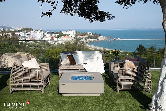 Elementi+ | Lucerne Gas Fire Pit Cast Concrete 42" Square Fire Table, Outdoor Fire Pit Electronic Ignition | Canvas Cover, Fire Glass and Burner Lid Included | Light Gray | Natural Gas