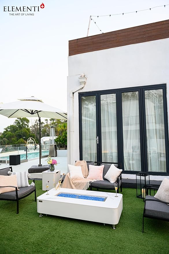 Elementi+ | Athens Gas Fire Pit | Cast Concrete Body & Marble Porcelain Top | 62" Rectangular Fire Table | Electronic Ignition | Canvas Cover, Fire Glass & Burner Lid Included | White | Natural Gas