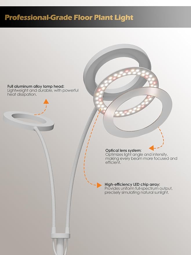 - Full Spectrum Floor Grow Light: Our grow light utilizes professional-grade 3000K warm white, 5000K daylight white, and 660nm deep red LEDs to closely mimic natural sunlight. Offers three preset spectrum modes: Seedling (soft light for root development), Growth (balanced spectrum for lush foliage), and Bloom (red-enhanced for flowering),delivering precise photosynthetic support for every stage.