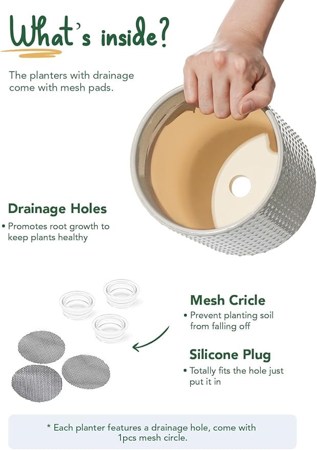 - Drainage Hole and Accessories: Each ceramic pots for plants features carefully designed drainage hole to maintain optimal soil moisture; the inclusion of silicone plugs and mesh pads provides added convenience, giving you flexibility in how you care for your plants