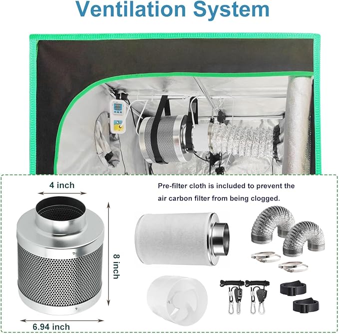 - ★【Complete Grow Tent System】1 x Grow Tent;1 x Full Spectrum LED Growing Light;2 x Air Ducts;1 x Extraction Fan;1x Carbon Filter;1 x Fan Plug; 2 x Water Dropper; 1 x Timer; 8 x Flange; 1x Goggles; x Thermostat; 1 x Plastic Floor Tray;1x Herb Dryer; 5x Hydroponics Sponge;1 x Power Supply;1 x Planting Bag;Lots of Accessiries;Grow Tent Size: 48" x 24" x 80" (L×W×H);Material: Steel + 600D Oxford Fabric + PVC;LED Grow Light Power:38W;Lifespan:>50,000 hours;