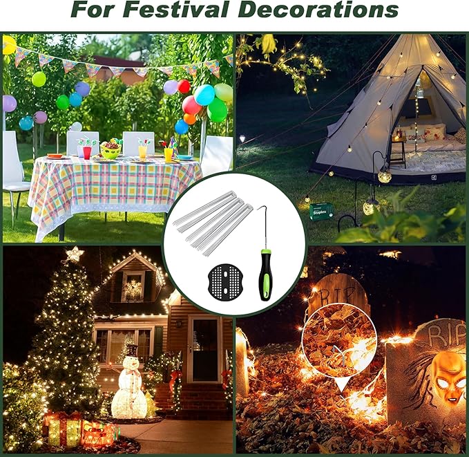 - 【MULTI PURPOSE】A very useful tool for outdoor activities. It can be used for Christmas decoration, Halloween lights stakes, yard, garden, lawn. Help you to fence in dogs, squirrels, rabbits. Help you to fix edging,plant roots, weed barrier landscape fabric or plastic, fences, hoses to keep your garden clean and tidy.These ground stakes hold plastic gaskets for Halloween Display as well as anchoring light strands and tombstones and other items.