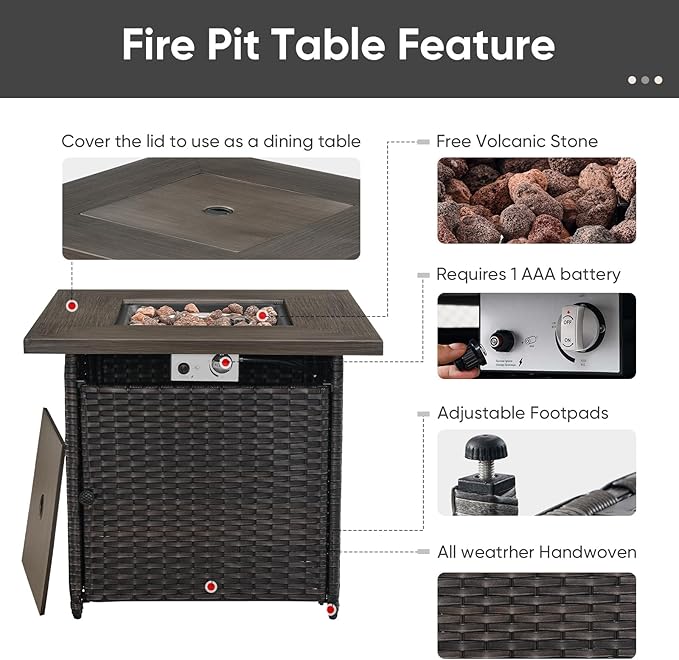 - 2 in 1 Outdoor Fire Pit Table:You can enjoy the warmth and ambiance outdoors with the CSA certified 50,000 BTU heat output fire pit table, you can also adjust the flame to your desired temperature with the control button,It can be used as dinning table when put the lid on.