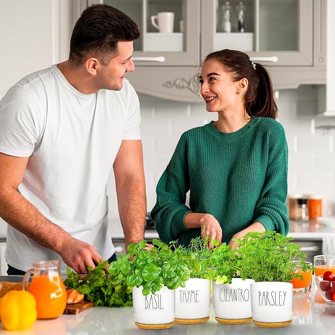 - Equipment & Accessories - This kit includes everything with nothing else to buy. You get 8 pots, 8 saucers to collect runoff, 8 expanding soil discs, and 1 kelp nutrition pack. We also include 8 transparent herb labels so you always know which pot holds which plant. Labels are printed in charming large Rae Dunn font to take the place of the usual stakes. These will look cute in your kitchen.