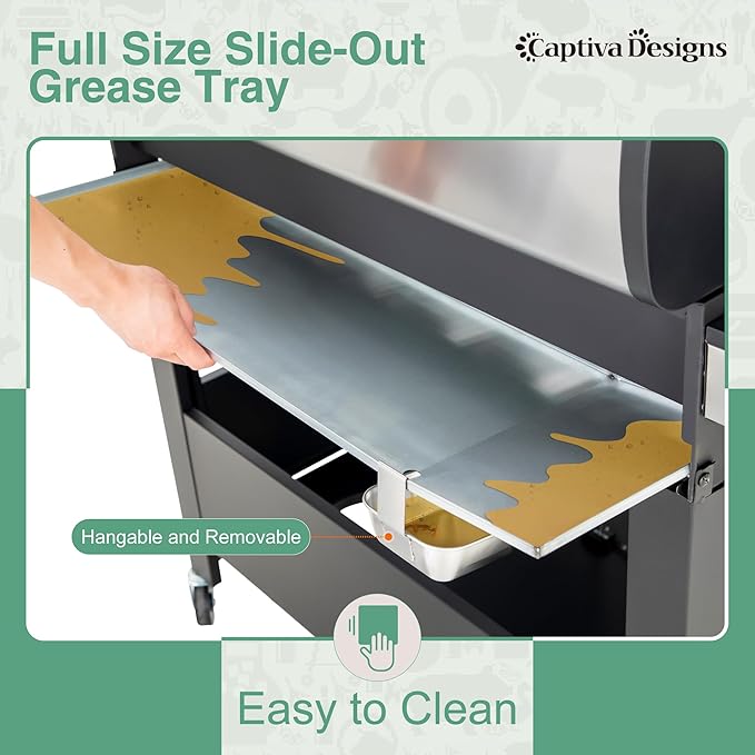 - ๐๐๐ฌ๐ฒ ๐ญ๐จ ๐๐ฅ๐๐๐ง: Below the grill chamber body, there is a fullsized slideout grease tray, and it has been designed with a tilt so that the grease can flow directly into the hanging grease box below. The design of the slideout greasetray and the hanging grease box makes grilling cleaning much easier after BBQ time