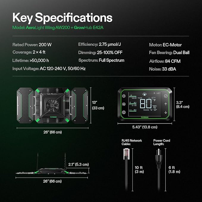 VIVOSUN AeroLight Wing AW200, Tunable Spectrum, LED Grow Light 200W with Integrated Circulation Fan & Growhub Controller E42A, Compatible with App & E25, 2x4/3x3Ft Coverage