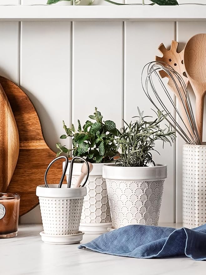 - Decor Living Space: Discover a cute embossed design ceramic pots β4 inches in diameter and 3 inches top opening, good for planting succulents and cacti. These ceramic flower pots add a touch of green to tables, windowsills, balconies, or bookshelves. Arctic white glaze, coupled with a light brown pattern, the delicate balance of embossed design and botanical vitality converges, creating an atmosphere of unparalleled grace and visual delight