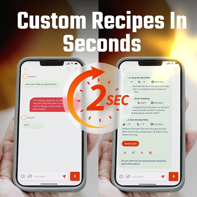 - VERA Generative Cooking A.I. – Your personal smart smoker grill assistant that understands natural language to generate customized recipes on demand. Just speak or type your request and Vera handles the rest—perfect for BBQ beginners and busy users