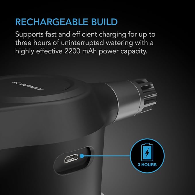 - Rechargeable sprayer with 2200 mAh power capacity supports up to 3 hours of continuous water diffusing.