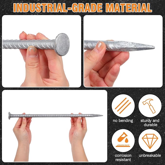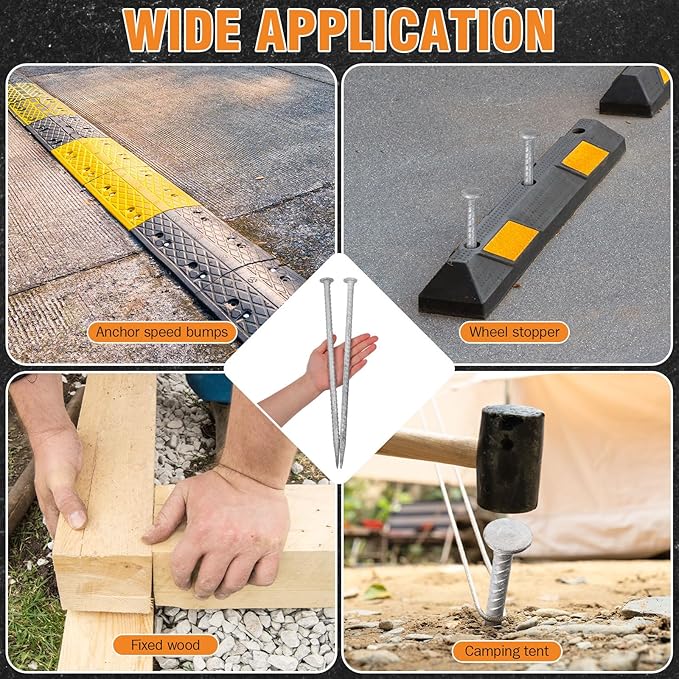 - Wide Application: from securing speed bumps and parking blocks to anchoring signs, fences, asphalt, blacktop, macadam, concrete, and other structures, these metal stakes for ground offer reliable support and stability; They can also be applied to secure trees, vines and other garden plants stakes support, landscape timbers, concrete forming, survey markers, camping tents; The large head of the metal stakes is easy to hammer, and the pointy end makes the stakes easy to insert into the ground