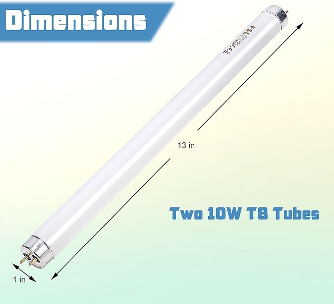 - ALL IN ONE SET: Package includes two T8 fluorescent light tubes measuring 13 inch in length, each with wattage of 10W, making them great suitable to serve for our 20W electric bug zappers (with ASIN B082F6HKZV).