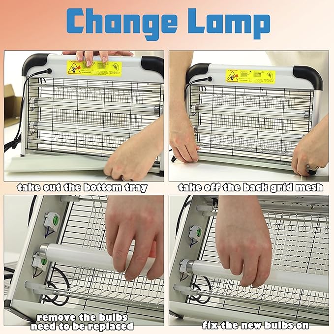 - EASY TO REPLACE: Take Lulu Home electric bug zapper for example. Take out the bottom tray and detach the back grid mesh. Then, remove the bulbs needed to be replaced and fix the new bulbs on. Fix and remove are usually needs to be done by rotating. The light tubes are fragile, please take care during the process.