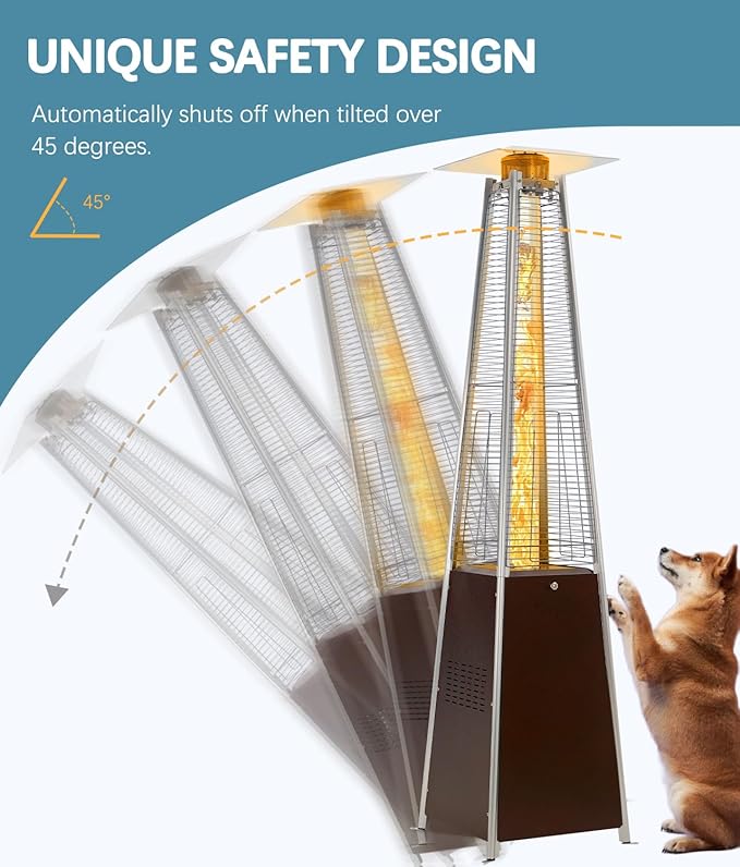 - 🔥【Safety Flame-Out Function】To avoid strong winds or accidental collisions, this outdoor propane patio heater features a safety auto flame out feature. When the heater is tilted more than 45 degrees, the fuel supply will automatically shut in time and the flame will go out automatically. Every product is factory tested for automatic flame failure, so you don't have to worry about safety.