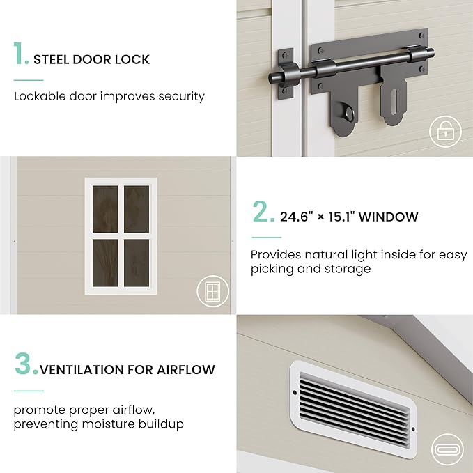 - STURDY FLOOR & WINDOW:Equipped with a sturdy floor, our outdoor storage cabinet effectively prevents moisture from seeping into the structure, safeguarding your belongings from potential damage caused by dampness, mold, or rot. The window design facilitates ventilation and natural light. It allows the visibility of tools from the outside and enhances the aesthetics of the shed