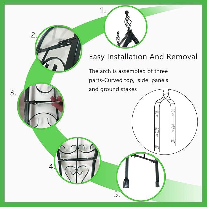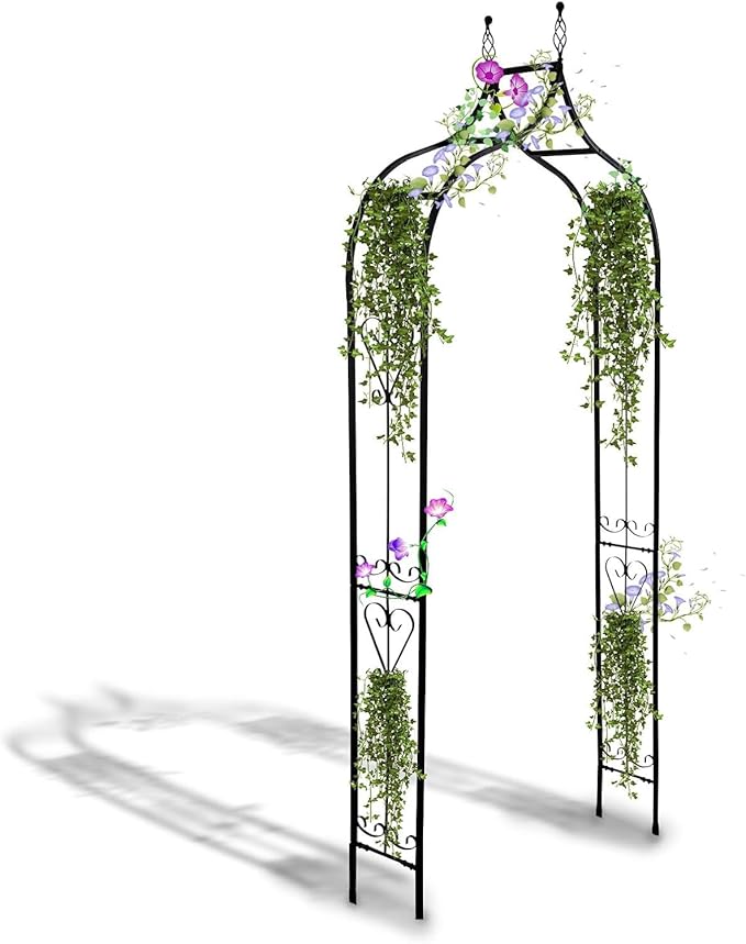 - 【Sturdy Construction Archway】Made of black heavy duty iron anti-rust frame. The trellis arch for climbing plants outdoor with powder coated material. The 8 inch ground spike inserts into the ground to add stability to the arches.