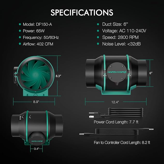 - 【205CFM EFFICIENT VENTILATION SYSTEM】The inline fan blades have a mixed flow design, the fan runs at 2600 RPM and provides 205CFM of airflow. Only 26.8 dB noise. 1050+ RC 48 Australian Virgin Charcoal with 25ft ducting,effectively filters impurities and odors from the air.The Temperature Humidity Controller can set the temperature and humidity that trigger the fan ON/OFF.