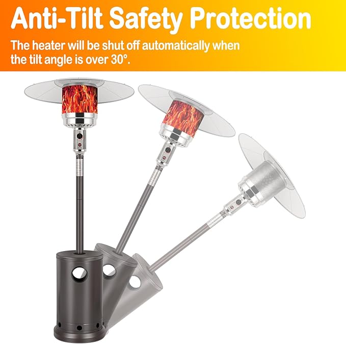 - 【Safety Design】The outdoor heaters for patio not only has high heating efficiency but also the designer has considered the safety factor in the design. One-press ignition for quick, easy starts. In particular, the umbrellalike design at the top allows for more uniform heating.The tilt protection system will extinguish the flame if the propane patio heater is tilted more than 45 degrees.