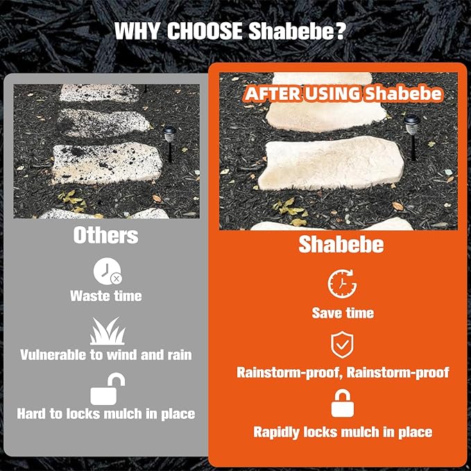 - 【Reliable & Weather-resistant】All Shabebe Mulch Anchor products have a 100% satisfaction guarantee. This mulch adhesive minimizes erosion due to intense rainfall and even prevents leaf blowers from dispersing your mulch. Simplify your life and put an end to the continuous sweeping and maintenance of your landscape!