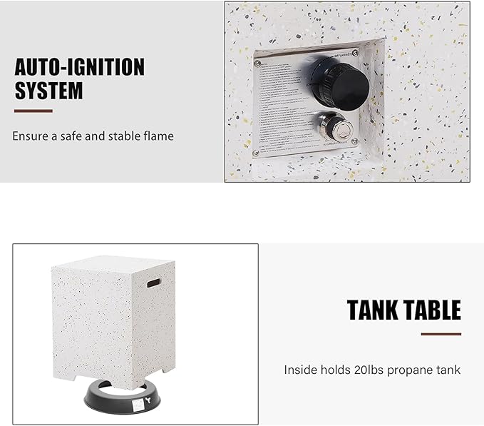 - 🔥Lightweight Concrete: This propane fire pit and tank holder set is constructed of lightweight concrete and features a modern light beige finish. This provides a highly durable structure that can hold a substantial amount of weight