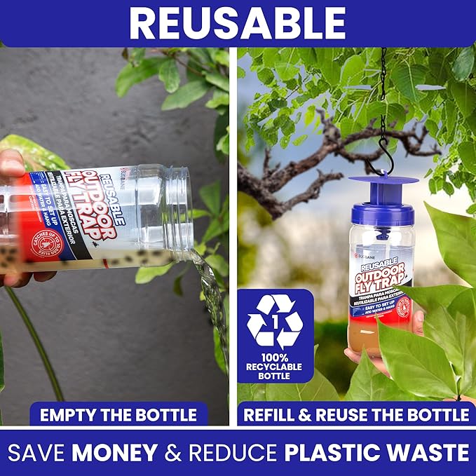 - HEAVY DUTY, REUSABLE. Our reusable fly traps outdoor is made of thick, durable plastic, and comes with multiple bait refill packets, so you can use it over and over again, saving you money and reducing plastic waste.