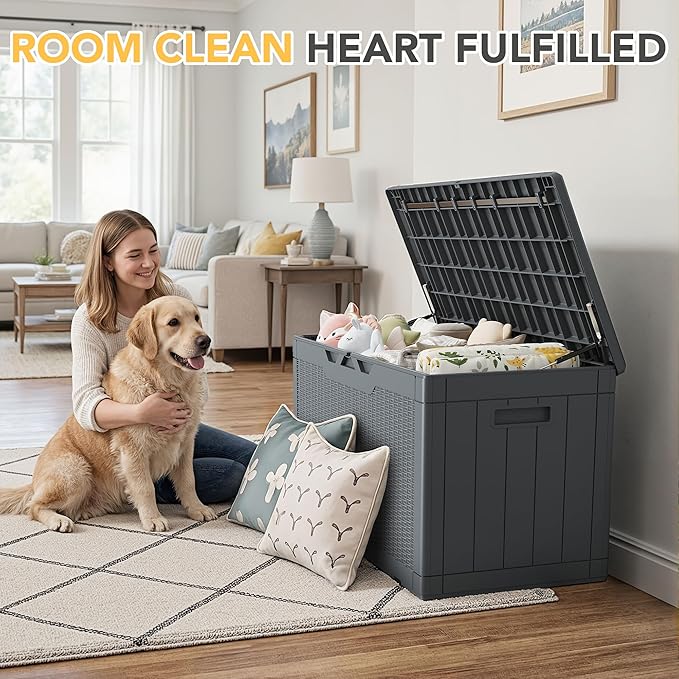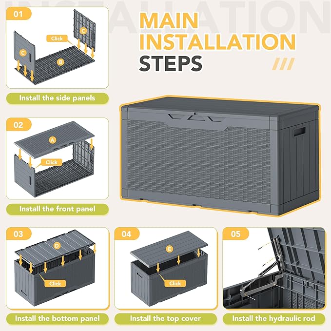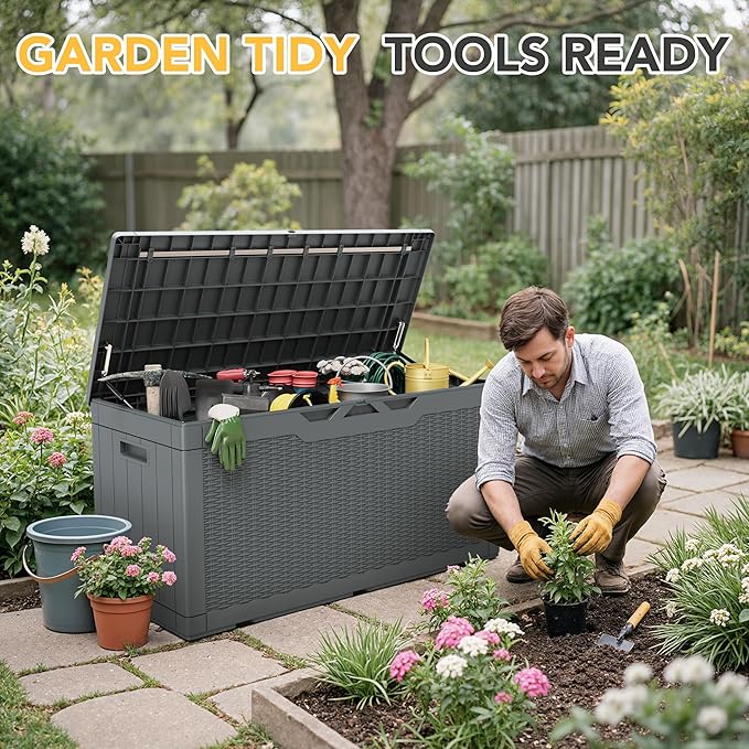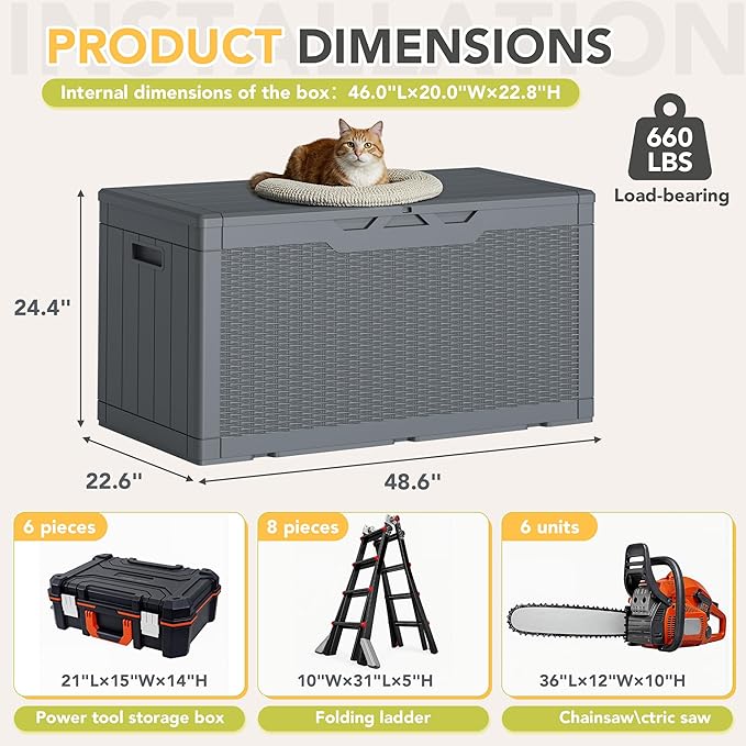 - WIDE VERSATILITY: The 100 gallon storage box can not only help you organize your patio or lawn. It can also be used as a table or bench when you need it, and the lid is equipped with a support bar inside, which can greatly enhance the stability and weight-bearing capacity of the storage box.