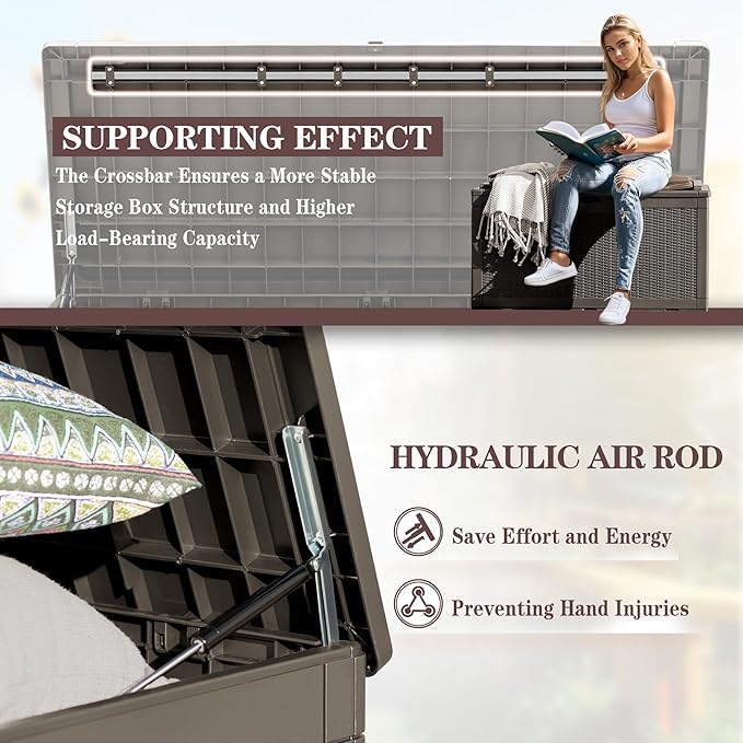 - PRACTICAL DESIGN: The deck box has a hydraulic holder design, which can prevent your hand from being caught when you open and close the box to ensure safety. Meanwhile, there is a support bar designed inside the lid, which can enhance the durability of the storage box.
