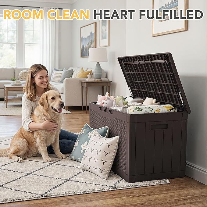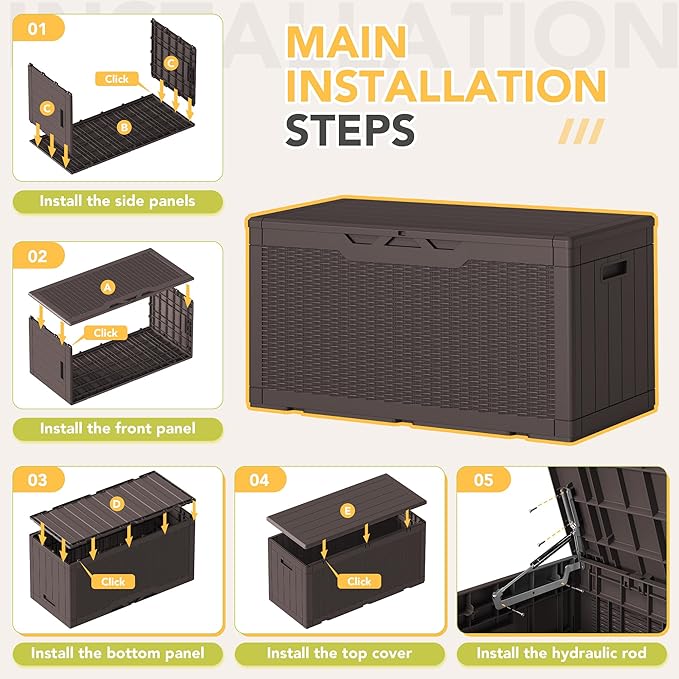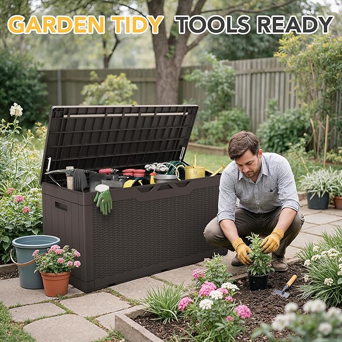 - WIDE VERSATILITY: The 100 gallon storage box can not only help you organize your patio or lawn. It can also be used as a table or bench when you need it, and the lid is equipped with a support bar inside, which can greatly enhance the stability and weight-bearing capacity of the storage box.