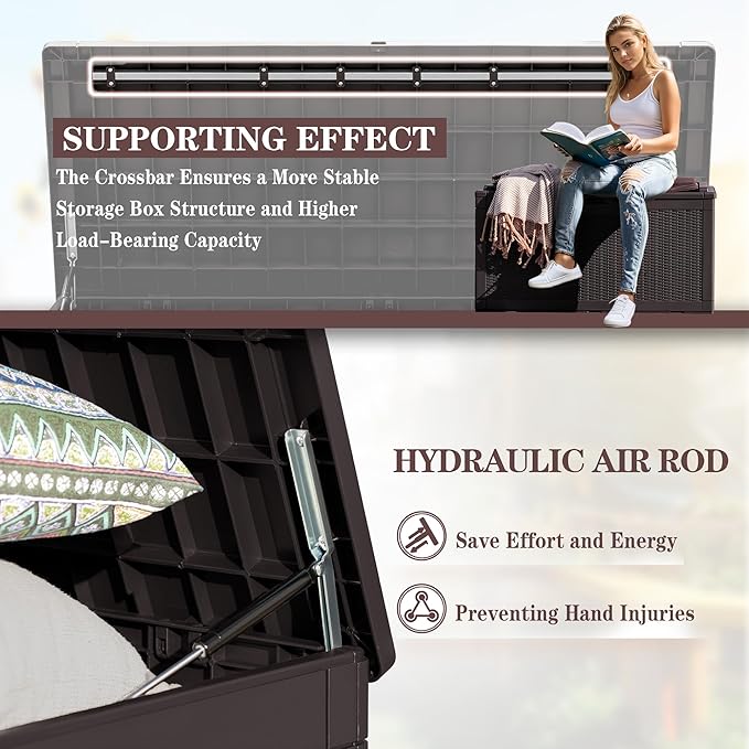 - PRACTICAL DESIGN: The deck box has a hydraulic holder design, which can prevent your hand from being caught when you open and close the box to ensure safety. Meanwhile, there is a support bar designed inside the lid, which can enhance the durability of the storage box.