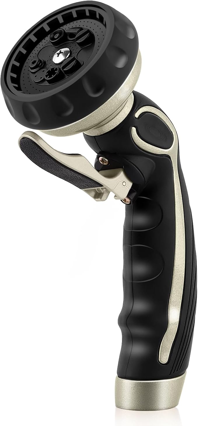 - 【Heavy Duty Garden Hose Nozzle】The nozzle gun body is constructed with zinc-alloy material, solid & robust to resist rust, corrosion and wear. The shock resistant rubberized bezel dial can enhance durability & flexibility and withstand hard impacts & heavy force in daily drops and shocks. It is much stronger, more durable and long-lasting than plastic water nozzles.