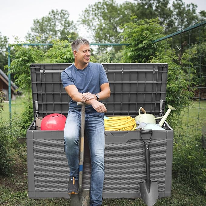 - WIDE VERSATILITY: The 100 gallon storage box can not only help you organize your patio or lawn. It can also be used as a table or bench when you need it, and the lid is equipped with a support bar inside, which can greatly enhance the stability and weight-bearing capacity of the storage box.