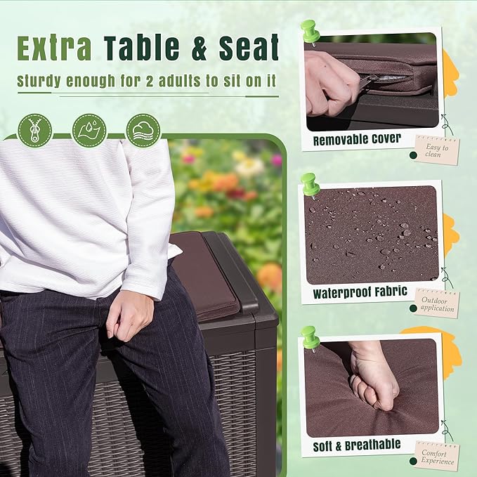 - EXTRA CUSHION:Besides helping you to organize your space, the deck box is equipped with a removable thick cushion, you can also use it as a stool to ensure your safety when opening and closing the box.