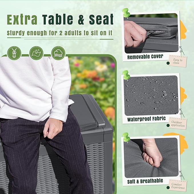 - EXTRA CUSHION:Besides helping you to organize your space, the deck box is equipped with a removable thick cushion, you can also use it as a stool to ensure your safety when opening and closing the box.