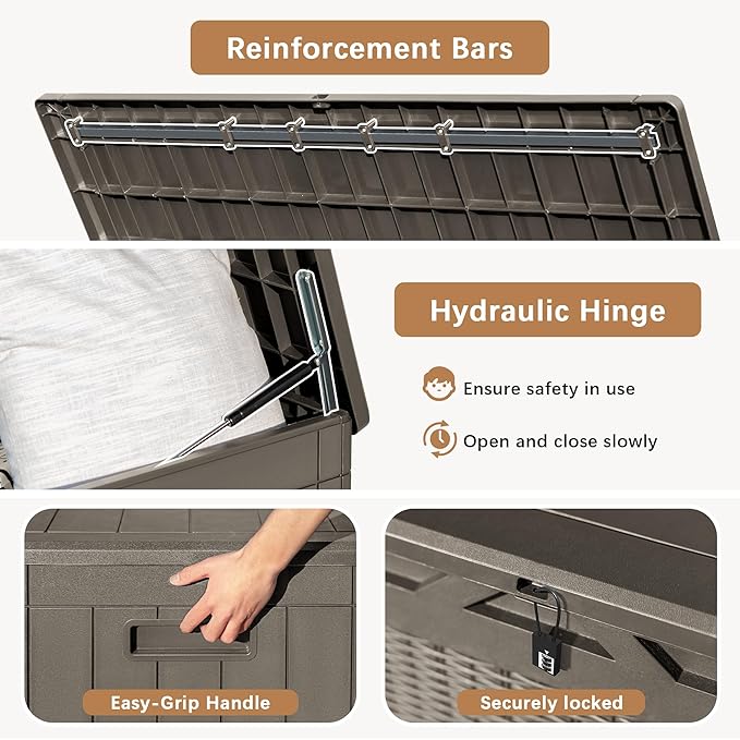 - Resistant Resin Material: Deck box is made of waterproof resin, with a complementing rattan pattern design, effectively preventing fading and rusting, while also maintaining a fresh appearance even with all-weather use