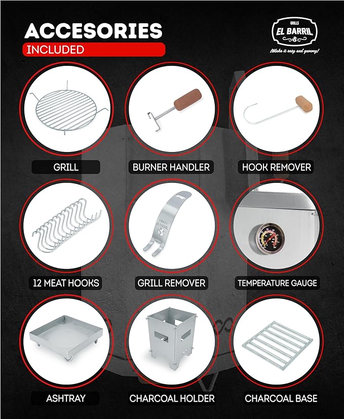 - Smart & Handy: El BARRIL 15lbs Portable Charcoal Grill Barrel with heatproof handles at sides & on cover top, comes with 12 Hooks, 1 Hook Remover, 1 Grill & its remover, 1 Ventilated Stainless Steel Charcoal Holder & Ashtray, a Temperature Gauge