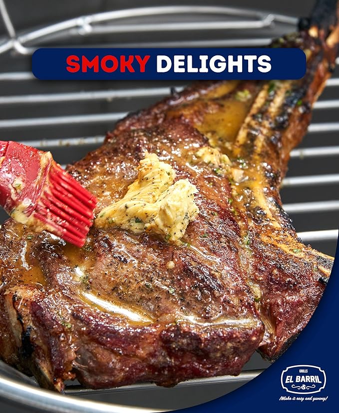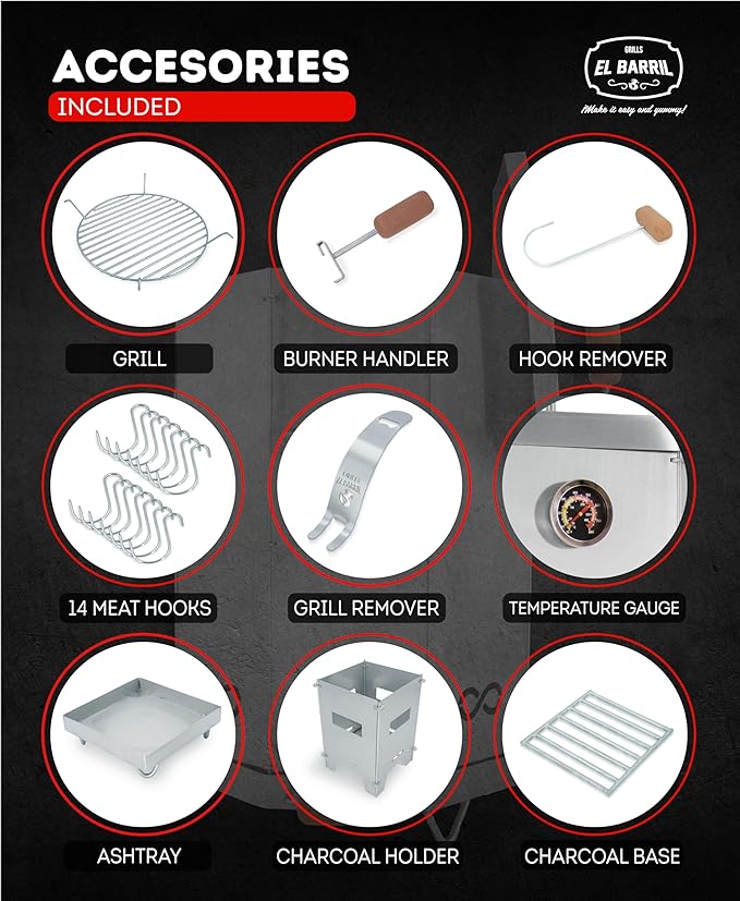 - Smart & Handy: EL BARRIL 20lbs Portable Charcoal Grill Barrel with heatproof handles at sides & on cover top, comes with 14 Hooks, 1 Hook Remover, 1 Grill & its remover, 1 Ventilated Stainless Steel Charcoal Holder & Ashtray, a Temperature Gauge