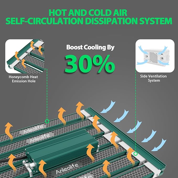 - Ultimate Temperature Control: Bar style grow light design and pure aluminum heat sinks contribute to better airflow, ventilation system on both sides with honeycomb holes design for efficient heat dissipation. Equipped with detachable driver and long power cord 9.8 ft, it can reduce the ambient heat in the growing space, with 30% higher cooling effect and 15% lower light attenuation than other LED lights, thus extending its lifespan