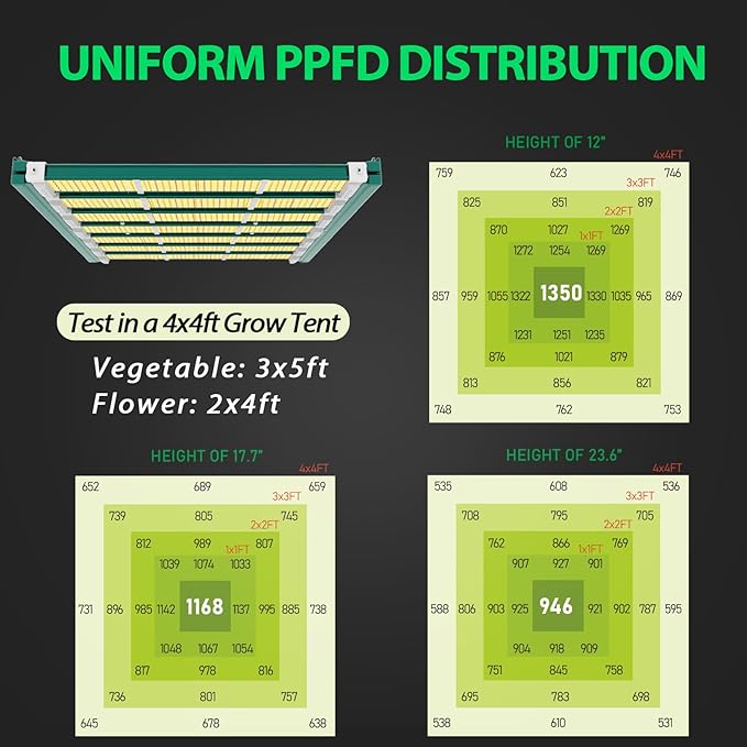 - High Efficiency & High Yeild: 1050pcs samsung LM301H EVO and LM281B+Pro LEDs, market-leading 2.7 µmol/J PPE, Max yield 2.5 g/W, achieving an impressive PPFD 1350 μmol/m²/s at 3x5ft core coverage. Compared with other similar lamps, the yield is increased by 20%, the average PPFD is increased by 20%, and the energy consumption is reduced by 10%