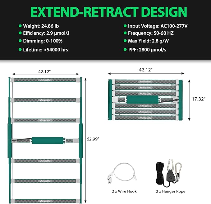- Unique Extend-retract Design: Freely adjustable light bar spacing to suit different plant growth stages. Bar structure is lightweight, easy to install, plug and play