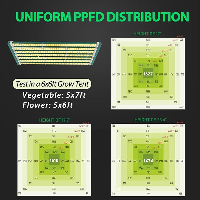 - High Efficiency & High Yeild: 2800pcs LM301H EVO and LM281B+Pro LEDs, market-leading 2.9 µmol/J PPE, Max yield 2.8 g/W, achieving an impressive PPFD 1627 μmol/m²/s at 5x7ft core coverage. Compared with other similar lamps, the yield is increased by 20%, the average PPFD is increased by 20%, and the energy consumption is reduced by 10%
